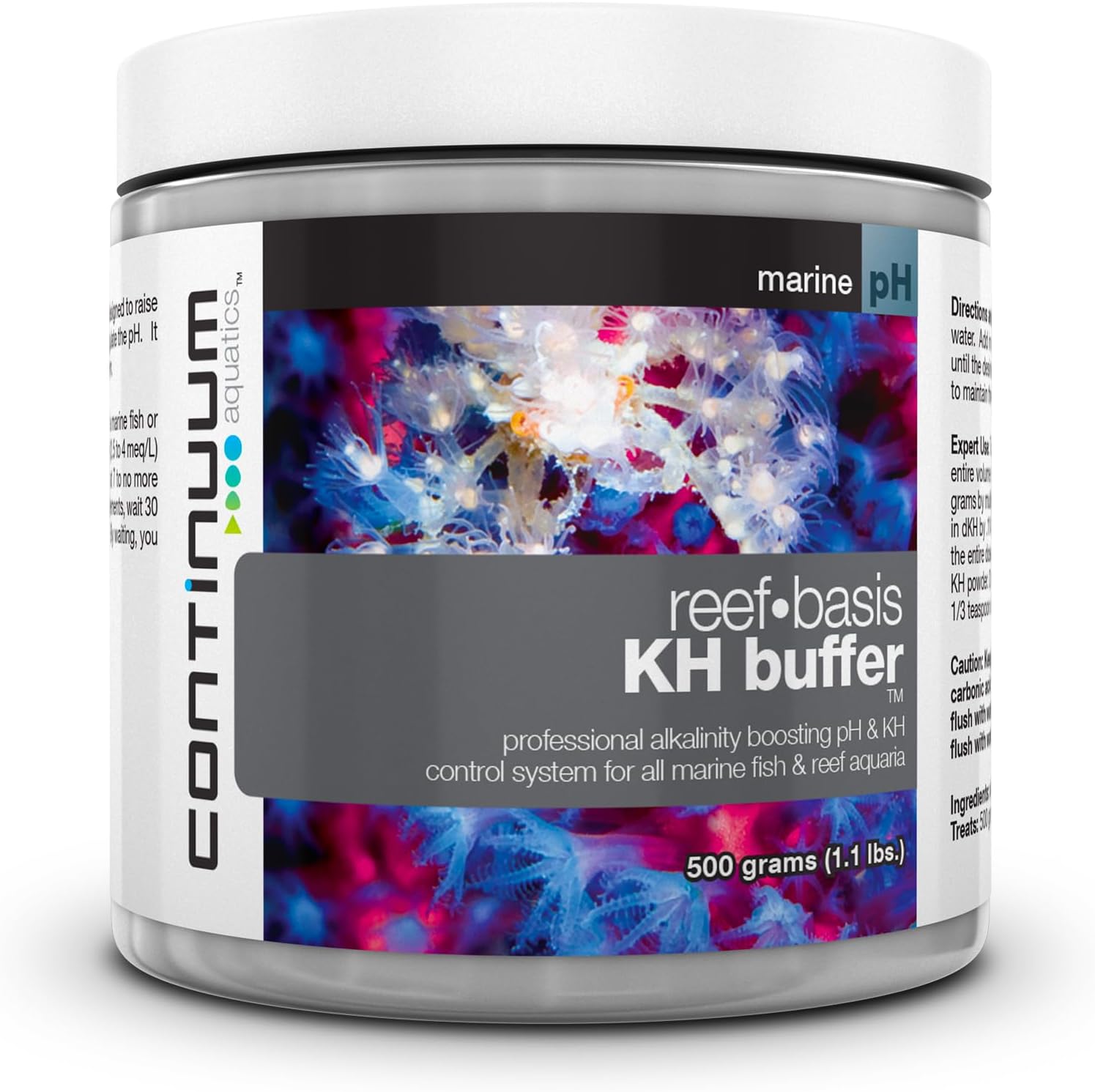 Use in Aquarium Keeping: Proper control of pH is one of the most critical functions of a marine fish or reef aquarium. Continuum recommends that you maintain an alkalinity level of 7 to 11 dKH (2.5 to 4 meq/L) and a pH of 8.3. *Note: Aquarists keeping SPS corals should consider keeping alkalinity at 7 to no more than 9 dKH (2.5 to 3.21 meq/L). Do not add simultaneously with calcium or mineral supplements, wait 30 minutes minimum and allow for plenty of circulation prior. Alternate days is even better. By waiting, you will avoid unnecessary precipitation and possible cloudiness.