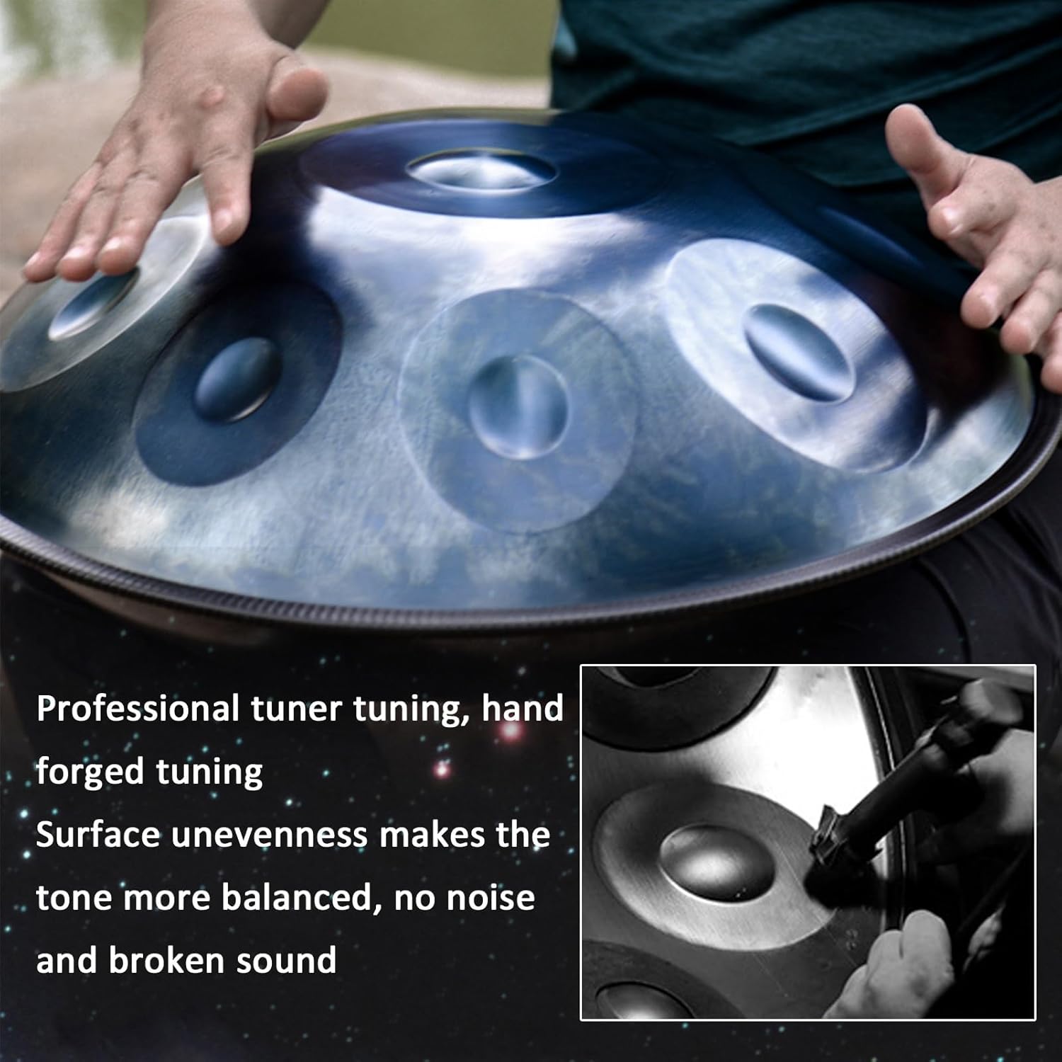 ▶Features: All notes have perfect resonance vibrations, each note is controlled with a tuner to minimize possible fluctuations. They can be played with a stick or with bare hands, beating, tapping or tapping with your fingers, without a fixed music background. You can play drums with your tongue improvising a lot, and you can do different performances every time, even on the same song. Tongue drums not only strengthen our passion, but also our physical and mental abilities and enhance spirituality. ●● ● 9 Tone D3/A3/Bb3/C4/D4/E4/F4/Sol4/A4 ●● ● 10 Tone : RE3/LA3/SIb3/DO4/RE4/MI4/FA4/SOL4/LA4/DO5 ●●● 12 Tones : D3/A3/Bb3/C4/D4/E4/F4/Sol4/A4/C5/D5/F5 ▶The sound is 440Hz. Beautiful vibrant sound. Material: Steel Diameter: 56 cm Height: 25 cm ▶Packing List: 1 * hand package, 1 * package, 1 * pair of chopsticks, 1 * towel, 1 * stent. ▶How to care for manual pan: ●Do not hit hard. ●Avoid direct sunlight and high humidity.
