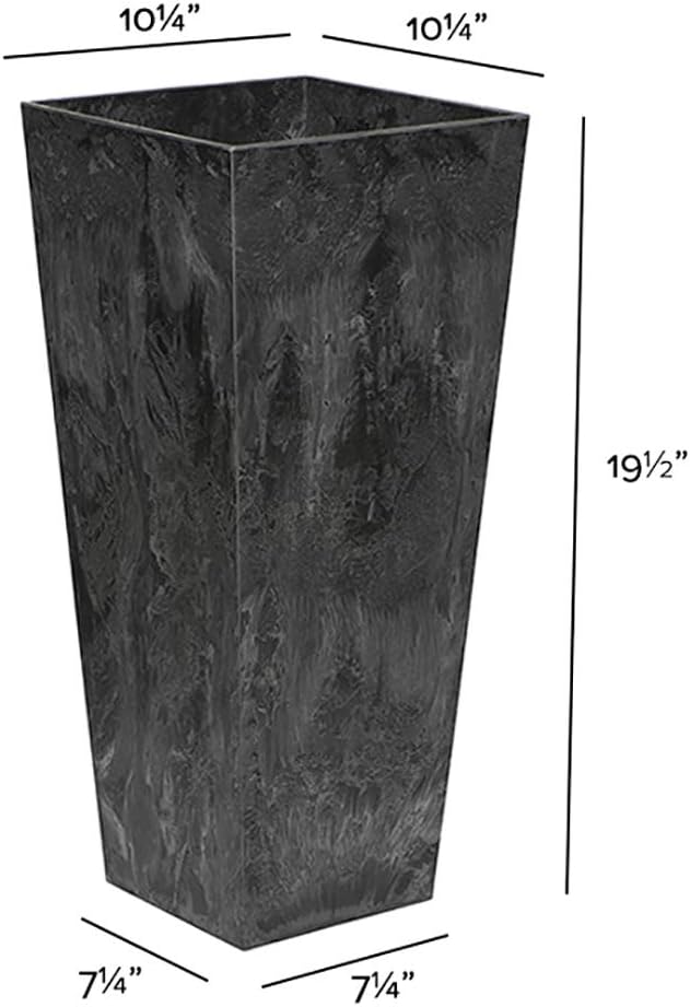 The Ella tall planter will enhance your indoor or outdoor decor with its modern, tapered, & unique design. Made with a proprietary blend of stone & resin for increased durability, you'll be enjoying this one-of-a-kind planter for years to come. In addition to its elegance, this tall square planter has a built-in Water-Minder, a self-watering component that provides continual hydration to the plants. These deep-vessel planters can accommodate larger plants, trees & shrubbery. Showcase your arrangements at every doorway, patio, deck or other living space with these beautiful, lightweight, durable, & thoughtfully-designed planters. Size dims. (L"xW"xH") bottom (sq. In.) 13.5" - 7.4"X7.4"X13.5" 5 sq. In. 19.5" - 10.2"X10.2"X19.25" 7 sq. In. 27.5" - 13.9"X13.9"X27.7" 9 sq. In. 35.5" - 15.75"X15.75"X35.5" 10.5 sq. In. For best results in sustaining healthy plants in an Ella tall planter: when using outdoors, prior to planting, invert planter & remove the rubber stopper. Removing the stopper will allow water to properly drain from the Ella tall planter. Store the stopper in safe place & replace the rubber stopper when moving your plants indoors. For additional soil aeration, add a soil amendment such a perlite, small stones, or clay piece to the bottom-and up to 1/3-of the container when deciding what to grow in the square planter. Check the planting instructions for the specific plant species. Follow the directions and, if planting multiple seeds or seedlings, place each plant the recommended distance between each plant to allow enough space between them to grow you will find a unique Water-Minder feature at the bottom of the Ella tall planter. If you remove this part during cleaning, please replace it before replanting. This piece is crucial to enable the self-watering feature of this planter. It helps water accumulate in the bottom reservoirs to recirculate & feed your plants during the growing season.