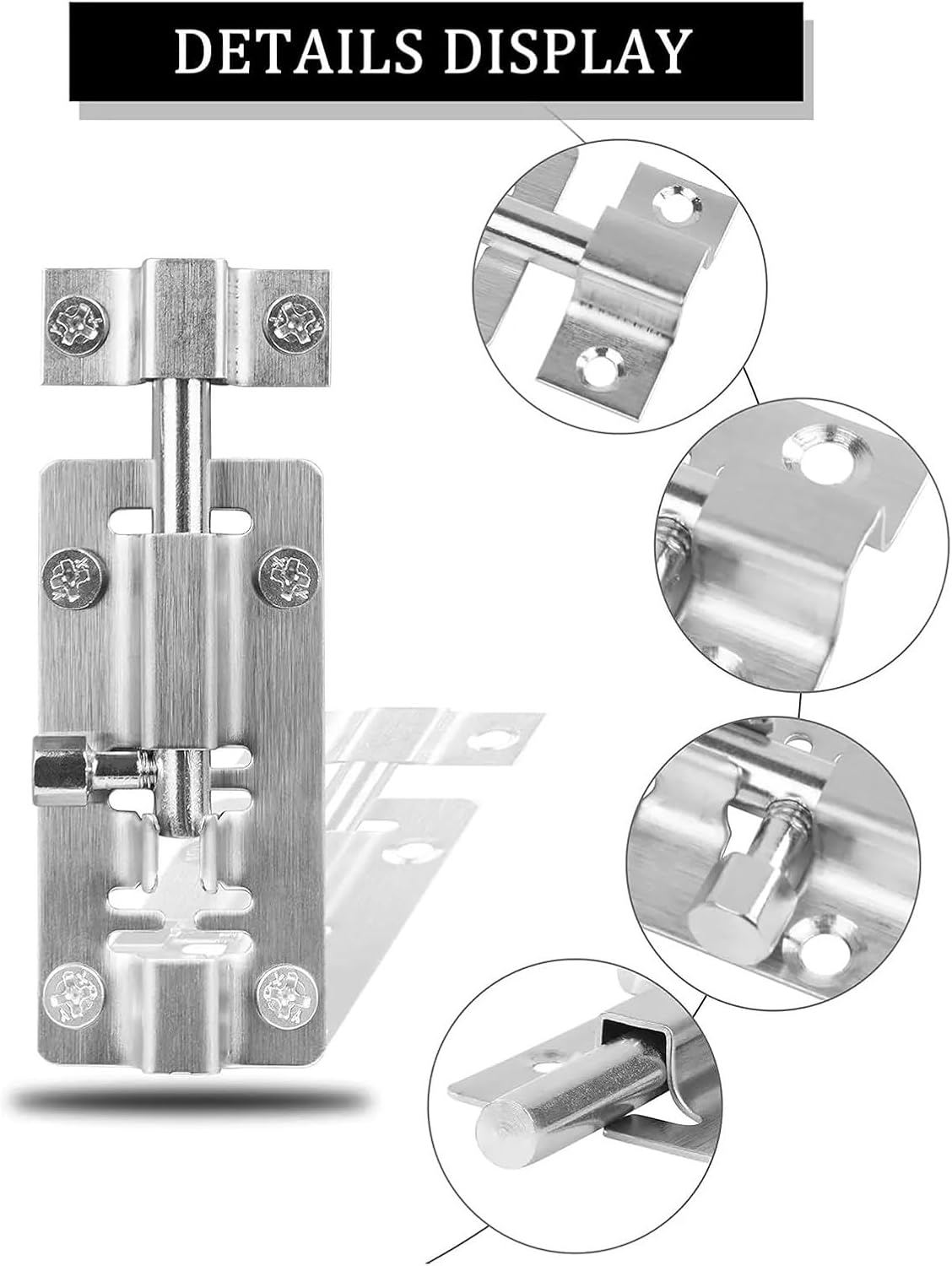 Product Name:Sliding Bolt Door LatchMaterial: 201 Stainless SteelSize: 2/2.5/3/4 InchesColor: SliverUse: doors, cabinets, Window, refrigerators, boxes, gates and cupboardsPackage: 1* Latch + 6* screws