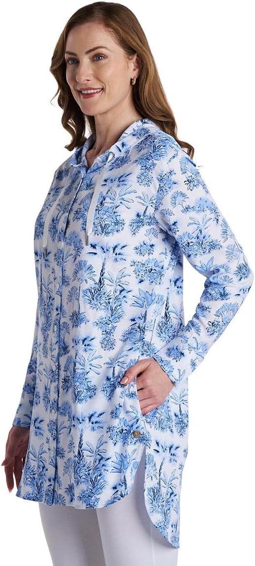 Lounge luxuriously in this light-as-Aire beach hoodie. Made of our most elegant UPF 50+ fabric with a beautiful, silky drape, the slight high-low cut and overlapped pleat details will flatter your every move! Our ultra-lightweight long sleeve shirt also features adjustable cuffs and a drawcord hood for extra coverage whenever you need it. For a top that’s so chic, the sun protection can be your little secret!
